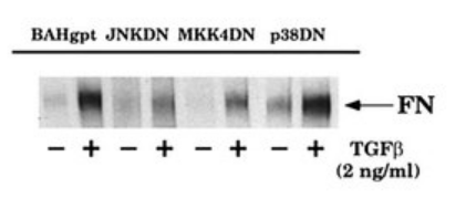 Comme nous le voyons sur la figure ci-dessus, l’activation de l’expression de la fibronectine passe par une voie de signalisation particulière, la voie de signalisation JNK. Une autre voie de signalisation, la voie p38 aboutissant à l’activation de ATF-2 et CREB ne semble pas impliquée (Hocevar et al., 1999).