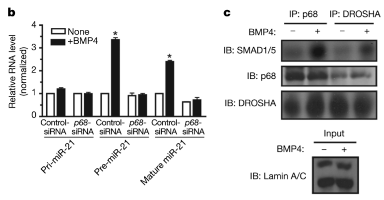 SMAD1/5/8 peuvent avoir des fonctions indépendantes de SMAD4. Notamment, ils peuvent se fixer sur le complexe Drosha et accélérer la maturation de pri-miARN en microARN. C’est le cas pour le microARN miR-21 qui contrôle la différenciation des cellules musculaires lisses de la paroi des vaisseaux sanguins sous le contrôle des BMP.