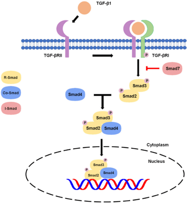 Les SMADs agissent ensuite comme effecteurs de signalisation. La phosphorylation C-terminale de SMAD2 ou SMAD3 par TβRI entraîne un changement de conformation qui favorise l’hétéromérisation avec SMAD4 et stimule la translocation nucléaire des complexes SMAD. Dans le noyau, les protéines SMAD régulent la transcription en se liant à l’ADN et en interagissant avec d’autres facteurs de transcription.