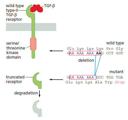 cadre de lecture lors de la traduction s’en trouve décalé. Il s’agit d’une mutation non-sens qui cause une fin prématurée de la traduction à cause de la présence d’un codon STOP dans le nouveau cadre de lecture. Le récepteur tronqué perd son domaine de signalisation intracellulaire C-terminal qui est crucial pour sa fonction. Cette perte permet aux cellules du carcinome du côlon de devenir résistantes aux effets inhibiteurs de croissance du TGF-β. Source : https://pubmed.ncbi.nlm.nih.gov/9872311/