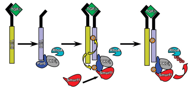 Outre l’activation de l’expression des coordinateurs majeurs de l’EMT, les facteurs de transcription de la famille Snail/Twist, les récepteurs TGF-β peuvent avoir un rôle plus direct : Par6, un régulateur de la polarité des cellules épithéliales et de l’assemblage des jonctions serrées, interagit avec les récepteurs TGF-β et est phosphorylée par le récepteur de type II, TGF-βRII. La phosphorylation de Par6 est nécessaire pour l’EMT dépendant du TGF-β dans les cellules épithéliales de la glande mammaire et contrôle l’interaction de Par6 avec l’ubiquitine ligase E3 Smurf1. Smurf1, à son tour, cible la petite GTPase RhoA pour la dégradation, entraînant ainsi une perte de jonctions serrées (Ozdamar et al., 2005).
