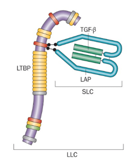 Après sécrétion par les cellules productrices, les ligands TGF-β (qui sont associés en homodimères) sont en majorité présents sous une forme latente car associés à la protéine LAP. Une interaction avec des intégrines (αvβ8 ou αvβ6 par exemple) permet à TGF-β de prendre sa conformation active, de quitter LAP et de s’associer à ses récepteurs (Brown et Marshall, 2019).