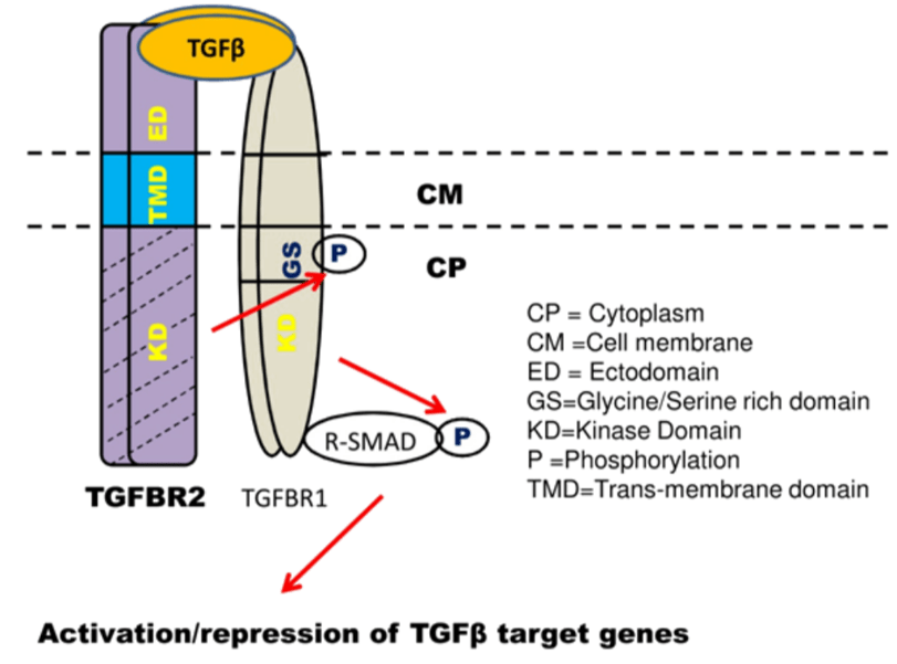 La signalisation TGF-β passe par deux types de récepteurs transmembranaires à activité sérine-thréonine kinase. La liaison du ligand au récepteur au TGF-β de type II (TβRII) stabilise la formation d’un complexe avec le récepteur au TGF-β de type I (TβRI) et induit l’activation du récepteur TβRI par la kinase du récepteur TβRII.