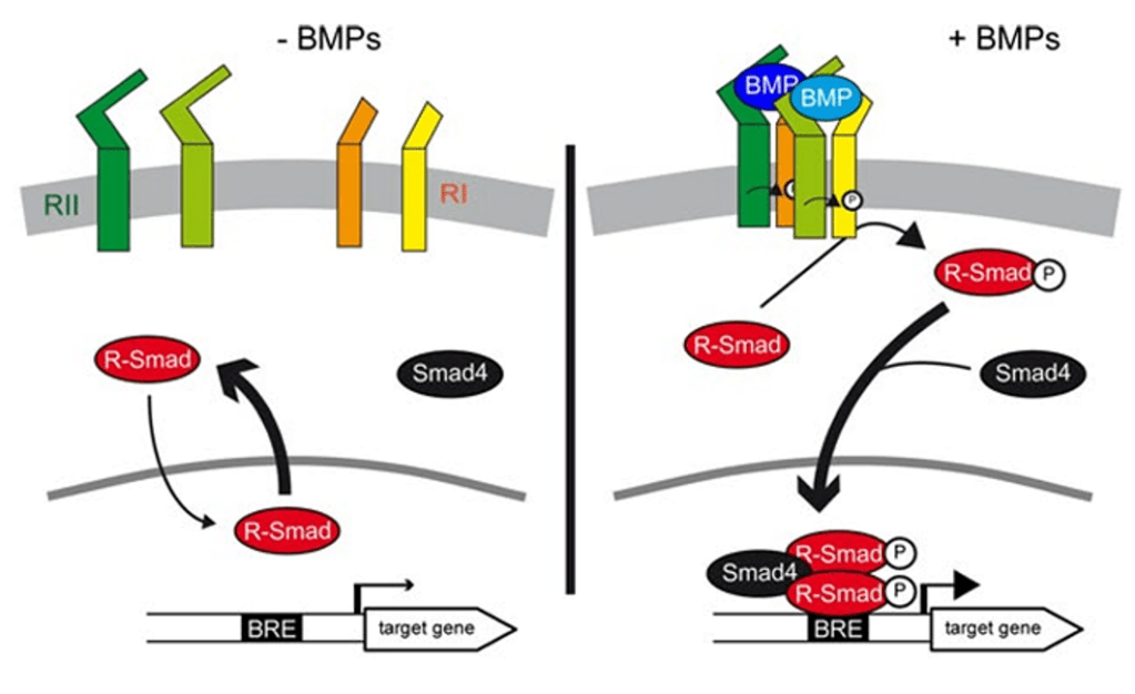 Les voies de signalisation activées ressemblent à celles de TGF-β mais ce sont les SMAD-1, -5 et -8 qui sont activées et non pas les SMAD-2 et -3. SMAD4 est toujours impliqué.
