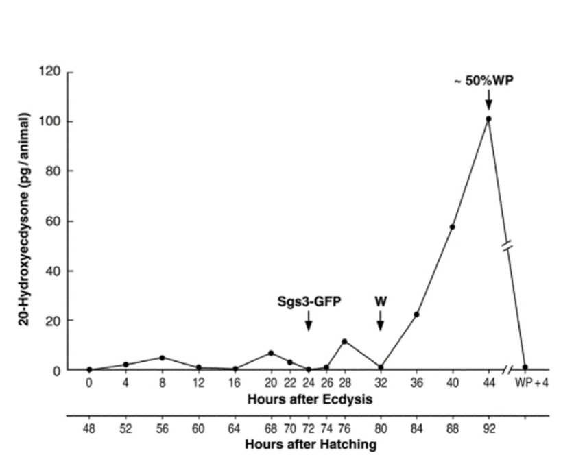 Chez la drosophile, une seule impulsion d’ecdysone déclenche chacune des deux premières mues larvaires (Warren et al., 2006). Au cours du stade terminal du troisième stade larvaire, trois impulsions de bas niveau suivies d’un pic élevé d’ecdysone initient les changements physiologiques et comportementaux nécessaires pour transformer une larve à la recherche de nourriture en une pupe immobile qui ne s’alimente plus. Bien que les rôles des pics initiaux d’ecdysone de bas niveau ne soient pas complètement compris, le dernier pic important déclenche la nymphose et le début de la métamorphose.