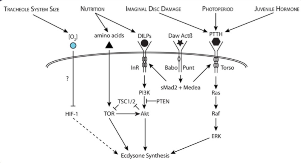 Il existe un lien entre la taille/le poids de la larve et la sécrétion d’ecdysone car le franchissement d’un seuil de poids aboutit à une mue avec un certain délai, même si on ne nourrit plus la larve après ce franchissement (Edgar, 2006; Mirth et Riddiford, 2007; Mirth et Shingleton, 201). Le corps gras détecte les conditions nutritionnelles (notamment le taux d’ATP et la concentration en acides aminés qui activent la voie TOR) et les communique au système nerveux central (SNC) via un signal dérivé du corps gras (FDS). Ce FDS agit sur les cellules neurosécrétoires pour réguler la production de peptides analogues à l’insuline de la drosophile (dILP). Les dILP régulent à leur tour le taux de croissance et la production de l’hormone de mue stéroïde ecdysone (E) par les cellules de la glande prothoracique. L’augmentation artificielle de dILP dans l’hémolymphe provoque un pic d’ecdysone et une métamorphose précoce (Walkiewicz et Stern, 2009).