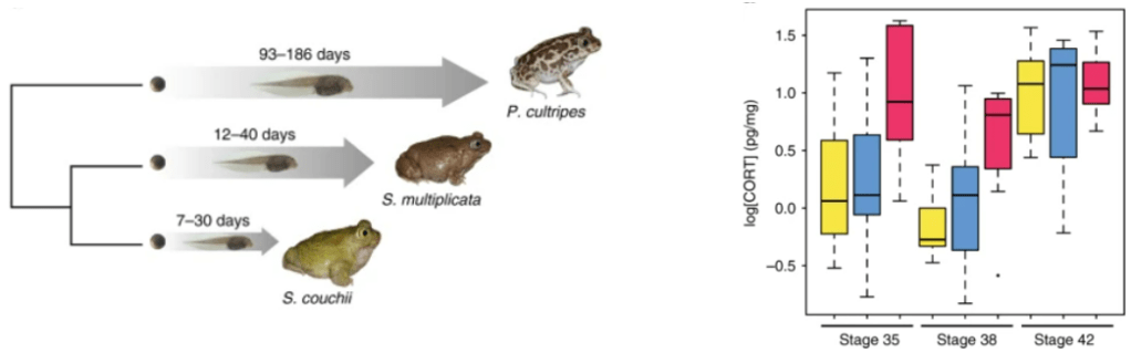 En dehors des hormones thyroïdiennes, la corticostérone produite par la glande corticosurrénale joue un rôle dans la métamorphose des Amphibiens. Elle retarde la croissance et la métamorphose des larves (Belden et al., 2005) mais une fois la métamorphose déclenchée, elle l’accélère (Darras et al., 2002). La sécrétion de corticostérone est produite lors d’un stress et on peut interpréter son action de manière adaptative : la métamorphose est une phase délicate et fragile du cycle de développement et il ne vaut mieux pas entamer une métamorphose dans un environnement stressant. Et si la métamorphose a été déjà déclenchée alors que l’environnement devient stressant, il vaut mieux en sortir le plus vite. Il y a néanmoins des exceptions. Par exemple, les têtards Scaphiopus couchii vivent dans des mares qui sont plus éphémères et sujettes au dessèchement que deux espèces proches. On constate que chez elle, son taux de corticostérone est constamment élevé (sans doute lié au stress hydrique) et que sa métamorphose se passe rapidement relativement aux deux autres espèces (Kulkarni et al., 2017).