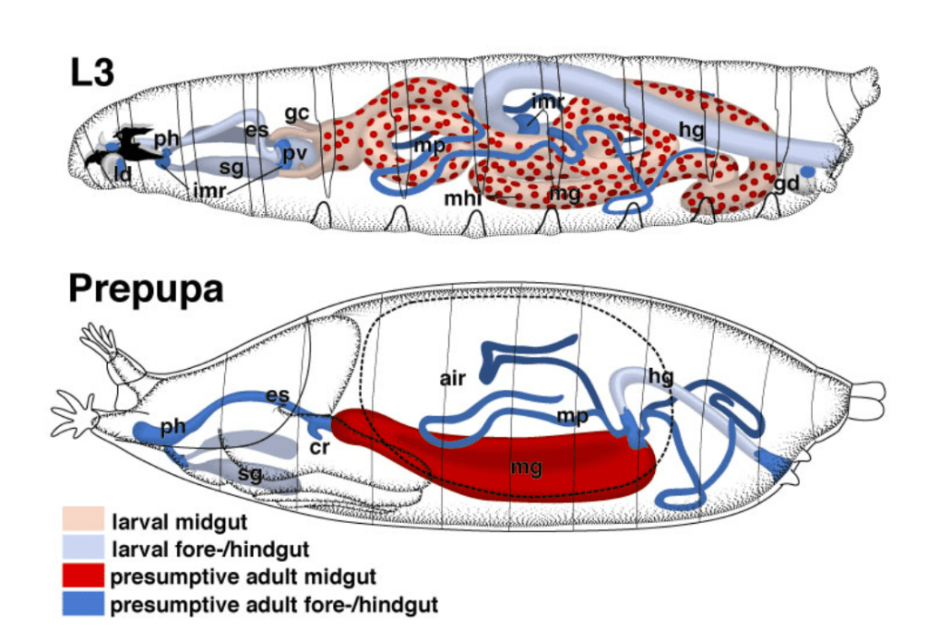 Durant la métamorphose dans l’intestin ou les glandes salivaires de la nymphe, E93 qui figure parmi les cibles des ecdystéroïdes active l’expression d’une batterie de gènes qui stimulent l’autophagie nommés Atg (Lee et al., 2002). L’inhibition de l’autophagie par des mutations de perte de fonction dans Atg1, Atg2 ou Atg18 retarde fortement l’élimination de l’intestin moyen (Denton et al., 2009). De plus, la surexpression d’Atg1 dans l’intestin moyen des larves est suffisante pour induire l’autophagie et une dégradation prématurée (Denton et al., 2012).