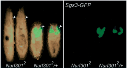 La 20-hydroxyecdysone agit sur ces cibles via un récepteur dimérique composé du récepteur à l’ecdysone EcR et de Ultraspiracle. EcR tout seul ne peut pas activer l’expression de gènes en présence de son ligand (Billas et al., 2003; Hu et al., 2003). Ultraspiracle est l’orthologue du récepteur RXR à l’acide rétinoïque des Vertébrés. En présence de 20-hydroxyecdysone, EcR recrute la protéine NURF qui est capable de faire glisser des nucléosomes le long de l’ADN et ainsi d’activer la transcription (Badenhorst et al., 2005).