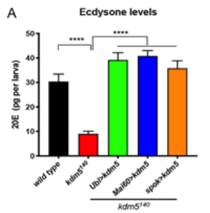 La production d’ecdysone par la glande prothoracique dépend de la maturation de ce tissu avec des cellules qui doivent devenir polyploïdes grâce à des cycles d’endoréplication. Cette étape est dépendante d’une histone déméthylase, KDM5, qui active (sans doute indirectement via des régulations de la transcription) la voie de signalisation MAPK qui est nécessaire à la production d’ecdysone (Drelon et al., 2019).