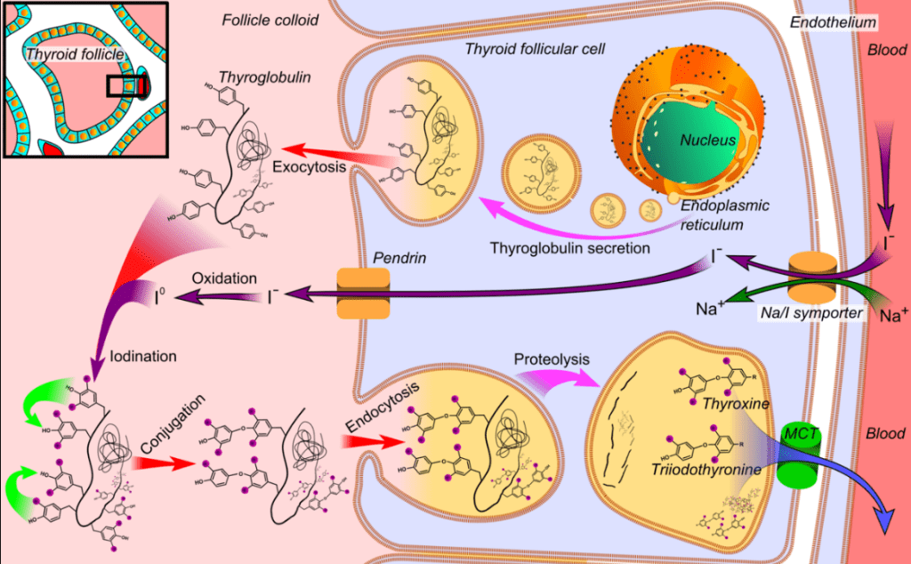 La métamorphose des Amphibiens est sous le contrôle des hormones thyroïdiennes. La glande thyroïde est homologue à l’endostyle des Cordés non vertébrés qui secrètent du mucus iodé. La thyroïde des Vertébrés a conservé un fonctionnement de glande exocrine tout en évoluant en glande endocrine. Les hormones thyroïdiennes sont produites à partir d’un grand précurseur protéique, la thyroxine, qui est exocytée au centre d’un groupe de cellules assemblées en acini. Des tyrosines de la thyroxine sont iodées puis clivées pour former les hormones thyroïdiennes qui traversent les cellules acineuses pour être sécrétées dans le sang.