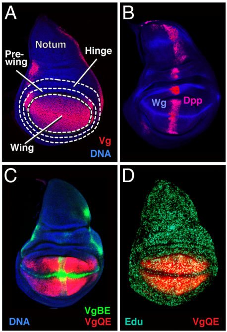La signalisation Notch réprime le QE. La croissance de l’aile proprement dite est assurée par la prolifération quasi uniforme de la population de cellules exprimant Vg dépendantes de QE (observée par l’incorporation d’EdU pendant la phase S dans D, turquoise). Source : https://www.pnas.org/doi/10.1073/pnas.2018196117