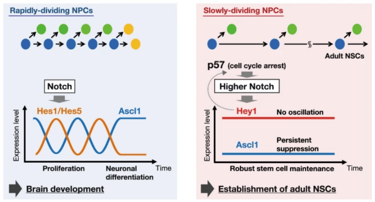 La plupart des cellules souches neurales adultes dans la paroi latérale de la SVZ sont dérivées d’une sous-population de cellules souches neurales embryonnaires en quiescence ou à division lente (tandis que la sous-population à division rapide donne naissance à des neurones et des cellules gliales qui peuplent le cerveau pendant le développement embryonnaire ou juste après la naissance) (Fuentealba et al., 2015). Une expression élevée de l’inhibiteur de CDK (CKI) p57 dans la sous-population à division lente inhibe la prolifération et la différenciation neurale et est nécessaire à la genèse des cellules souches neurales adultes (Furutachi et al., 2015). La voie Notch a été impliquée dans cette régulation (Harada et al., 2021).