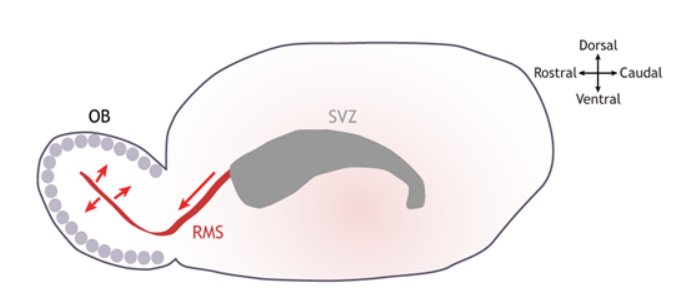 Les cellules souches neurales adultes dans la SVZ sont dites de type B. A division lente, elles produisent par division asymétrique des cellules de type C qui produisent à leur tour des neuroblastes de type A (exprimant la doublecortine (DCX)), et ceux-ci migrent en avant le long du flux migratoire rostral (RMS), se différenciant finalement en neurones qui s’intègrent dans les circuits du bulbe olfactif (Alvarez-Buylla et al., 2001).