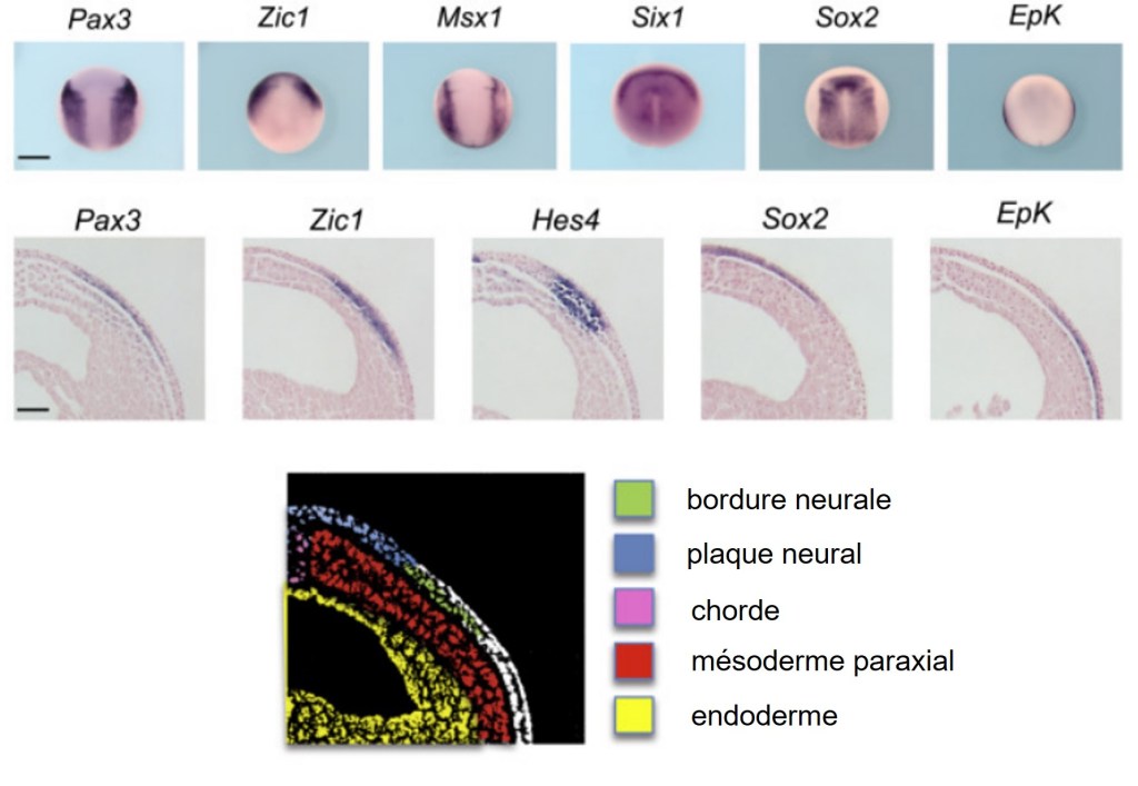 La co-immunolocalisation de marqueurs de la plaque neurale (Sox2), de la bordure neurale (Pax7), de la bordure neurale et de l’ectoderme non-neural (Tfap2a, Msx1/2) et des progéniteurs de la placode (Six1) a montré que ces marqueurs se chevauchent largement dans les cellules de la bordure neurale chez le poulet (Roellig et al., 2017). Cette co-expression de plusieurs marqueurs est maintenue du début de la neurulation jusqu’à la fermeture du tube neural. En supposant que chacun de ces marqueurs prédit fidèlement des destins cellulaires distincts, cette étude indique que la bordure neurale n’est pas divisée en régions à destins bien définis avant la fermeture du tube neural. Ce n’est qu’après que les différents territoires se définissent précisément.