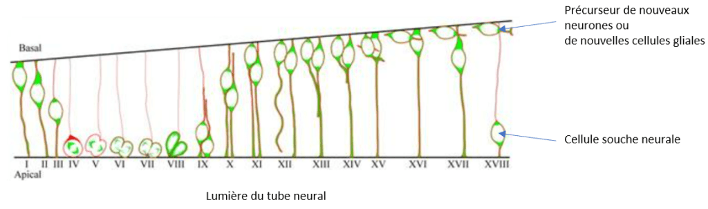Des expériences de suivi de cellules marquées avec un gène rapporteur introduit par un vecteur rétroviral dans le tube neural d’un embryon de poulet ont montré que ce sont les mêmes cellules souches neurales qui donnent naissance aux neurones et aux cellules gliales (Leber et al., 1990).
