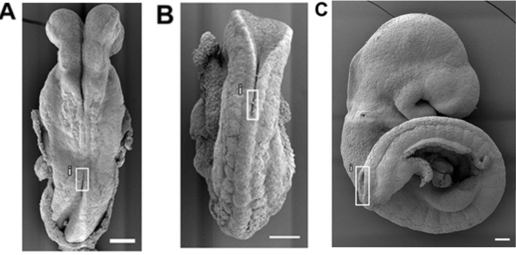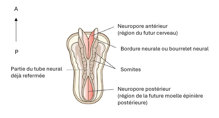 L’échec de la fermeture complète du tube neural entraîne des malformations congénitales : anencéphalie quand pas de fermeture à l’avant et spina bifida quand pas de fermeture à l’arrière. Les anomalies de fermeture du tube neural sont parmi les malformations congénitales humaines les plus courantes, affectant 1 grossesse sur 1000 dans le monde (Copp et al., 2013).
