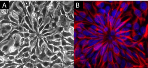 Lorsqu’on différencie des cellules souches pluripotentes en cellules souches neurales in vitro, elles prennent la forme de rosettes, mimant la polarité apico-basale du tube neurale.