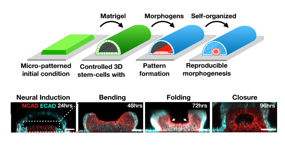 Des équipes de recherche travaillent également à faire mimer in vitro à des cellules dérivées des cellules souches pluripotentes humaines les mouvements de la neurulation (Karzbrun et al., 2021).