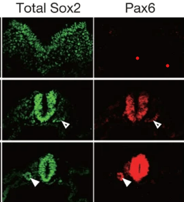 Chez tous les vertébrés étudiés à ce jour, le facteur de transcription Sox2 est un marqueur général très précoce de la plaque neurale en développement. Chez le poulet, par exemple, l’expression de Sox2 commence au stade de la ligne primitive tardive (stades HH 4–4+) dans le futur territoire neuronal. Une plaque neurale morphologiquement reconnaissable ne devient visible qu’après le début de l’expression de Sox2.
