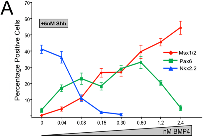 Les positions dorso-ventrales correspondent à des positions médiolatérales dans la plaque neurale avant la fermeture du tube neural. Les identités neuronales à différentes positions médio-latérales dans la plaque puis dorso-ventrales dans le tube sont régulées par les protéines sécrétées Shh, Wnt et BMP, avec des niveaux élevés de Shh produisant des destins cellulaires ventraux, des niveaux modérés de Shh et de BMP produisant des destins cellulaires intermédiaires et des niveaux élevés de Wnt et BMP produisant des destins cellulaires dorsaux (Dessaud et al., 2008 ; Sagner et Briscoe, 2019). Une polarité antéro-postérieure est aussi établie.