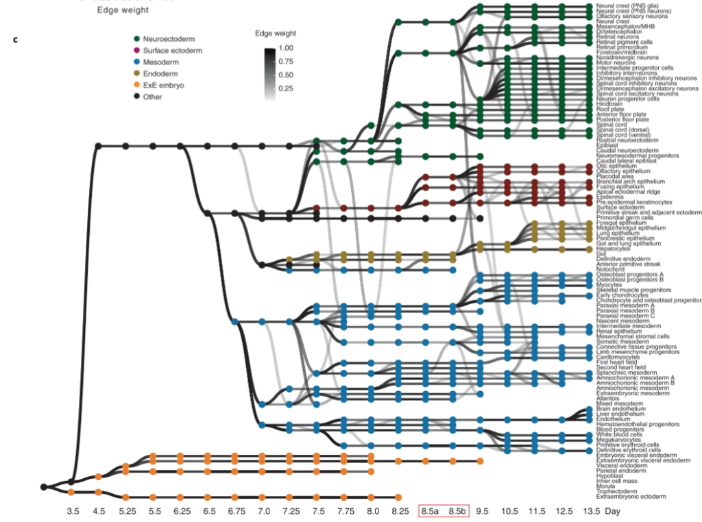 Le développement chez la souris, comme dans d’autres modèles, est de plus en plus étudié à l’échelle transcriptomique et cellulaire par scRNAseq (analyse transcriptomique sur cellules isolées). Des lignages basés sur la compilation de plusieurs études à différents stades ont pu être établis (Qiu et al., 2022).