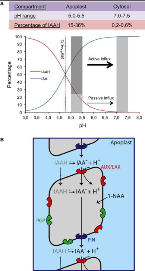 L’IAA peut se déplacer à travers la membrane plasmique par diffusion passive sous sa forme non chargée (IAAH), alors que sous sa forme anionique (IAA-), il nécessite des transporteurs spécifiques d’efflux et d’influx d’auxine (Petra´sˇek et Friml 2009).