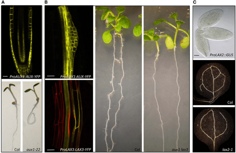 Une asymétrie dans la distribution de l’auxine et de la réponse à l’auxine a été effectivement détectée dans les tiges et les racines de diverses espèces végétales.