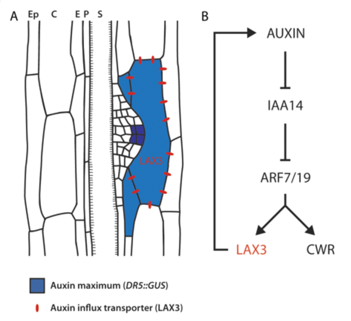 Les transporteurs d’entrée (ou d’influx) de l’auxine dans la cellule sont impliqués dans la régulation du développement des racines secondaires. Par exemple, AUX1 est exprimé dans les cellules du péricycle avant la première division asymétrique initiale. Le mutant aux1 présente une réduction de 50% du nombre de racines secondaires (Hobbie et Estelle, 1995; Marchant et al., 2002).