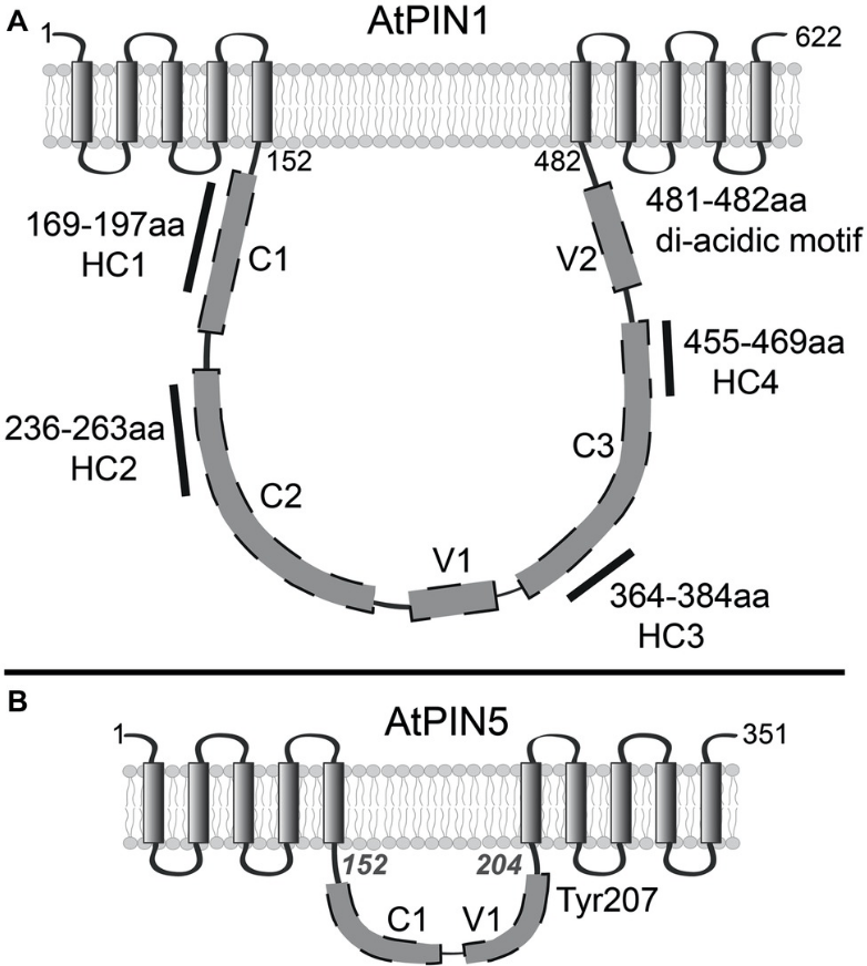 Les longues boucles des PIN canoniques ont des sites de phosphorylation qui régulent l’activité ; les boucles sont auto-inhibitrices, nécessitant une activité kinase pour initier le transport.