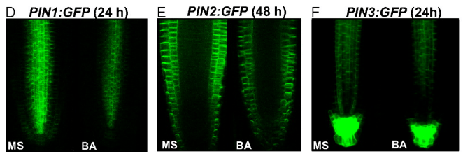 Chaque transporteur PIN a un profil d’expression différent et un fonctionnement spécifique. Par exemple dans les racines, les protéines PIN1, PIN3 et PIN7 des tissus vasculaires et PIN2 du cortex dirigent l’auxine vers l’apex radiculaire, tandis que la protéine PIN2 des cellules épidermiques redirige l’auxine vers les tissus internes. La protéine PIN2 présente un taux de transport plus lent que les protéines PIN1 et PIN3. Cette différence de taux de transport de l’auxine pourrait être cruciale pour réguler la distribution de l’auxine à travers l’apex de la racine, notamment pour le gravitropisme racinaire, probablement car il permet à la persistance de l’auxine dans les cellules épidermiques de diriger la courbure racinaire (Janacek et al., 2024).