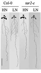 Lorsqu’il existe un déficit modéré en nitrate dans le sol, Arabidopsis forme des racines avec une quantité plus importante de racines secondaires. Cela est du à une plus importante concentration d’auxine dans la racine par une stimulation du transport de l’auxine des parties aériennes vers les parties racinaires. A l’inverse, un excès de nitrate inhibe ce transport (Tian et al., 2008). En cas de déficit de nitrates, il y a aussi une production racinaire plus importante d’auxine par l’augmentation de l’expression de TAR2, une enzyme intervenant dans sa biosynthèse, dans le péricycle et les éléments vasculaires (Ma et al., 2014).
