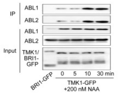 Cependant, certaines actions de l’auxine comme l’entrée de Ca2+ dans le cytoplasme, une hyperpolarisation membranaire, le contrôle de l’endocytose ou l’activation des GTPases ROP sont trop rapides pour ne dépendre que du contrôle de la transcription (Dubey et al., 2021). Il existe donc des récepteurs transmembranaires sensibles à l’auxine extracellulaire et activant des voies de transduction rapides dans la cellule. En présence d’auxine extracellulaire (apoplastique), les protéines extracellulaires ABL1 et ABL2 forment un complexe avec la protéine transmembranaire TMK ce qui active l’activité kinase à son extrémité intracellulaire de TMK (Yu et al., 2023).