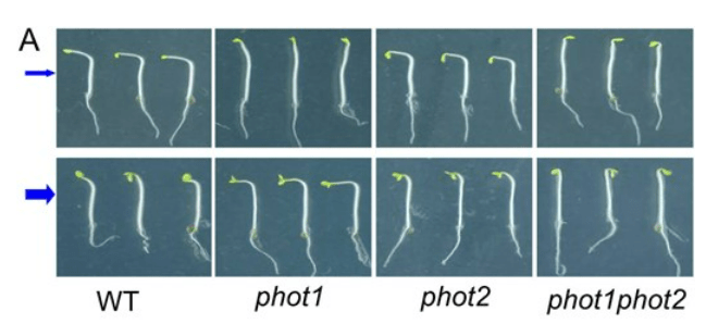 Pour le phototropisme, la lumière est perçue par les phototropines qui sont sensibles aux longueurs d’onde correspondant au bleu. Il en existe deux chez les plantes : phot1 et phot2. Sous une lumière bleue de faible intensité , phot1 est le récepteur principal contrôlant le phototropisme, tandis que dans des conditions de lumière bleue modérées à élevées, phot1 et phot2 agissent de manière redondante (Liscum et Briggs, 1995; Sakai et al., 2000, 2001).