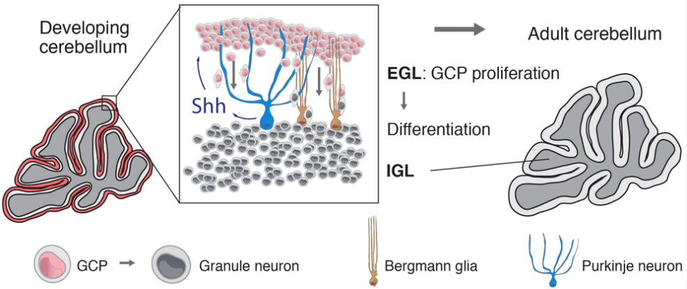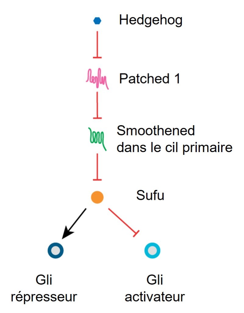 Shh est impliqué dans le développement du cervelet post-natal et a été impliqué dans la genèse de 25 à 30% des médulloblastomes, un type de cancer touchant essentiellement les enfants qui se développe dans le cervelet. Des mutations de PATCHED-1, de SMO et de SUFU ont été caractérisées dans ces tumeurs (Raducu et al., 2016; Tamayo-Orrego et Charron, 2019). Les cellules tumorales expriment le marqueur Atoh1 des précurseurs des cellules granulaires et ces dernières sont très probablement les cellules d’origine des cellules tumorales. Cet exemple illustre le fait que les cellules tumorales gardent une signature des cellules qui leur ont donné naissance. Cela affecte les propriétés de ces cellules et donc le pronostic et les traitements à mettre en œuvre.