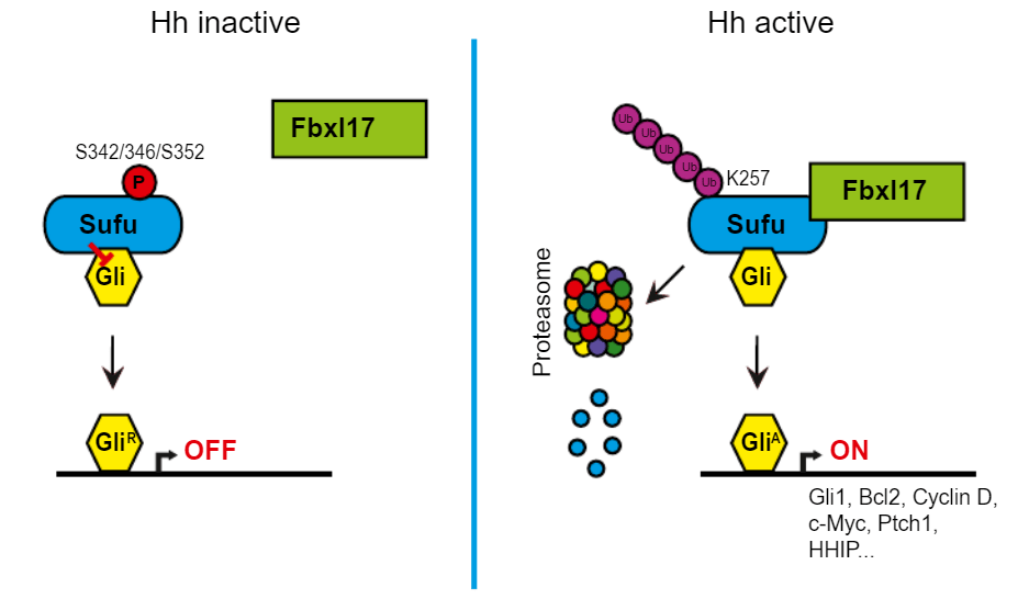 Shh inactive Sufu en favorisant sa poly-ubiquitinylation sur la lysine 257, ce qui conduit à sa dégradation dans le protéasome. C’est la protéine E3 ligase Fbxl17 qui cible Sufu (Raducu et al., 2016). La phosphorylation de Sufu sur les Ser-346 et 342 par la PKA et la glycogène synthase kinase 3β (GSK3β) stabilise Sufu contre la dégradation induite par Shh.