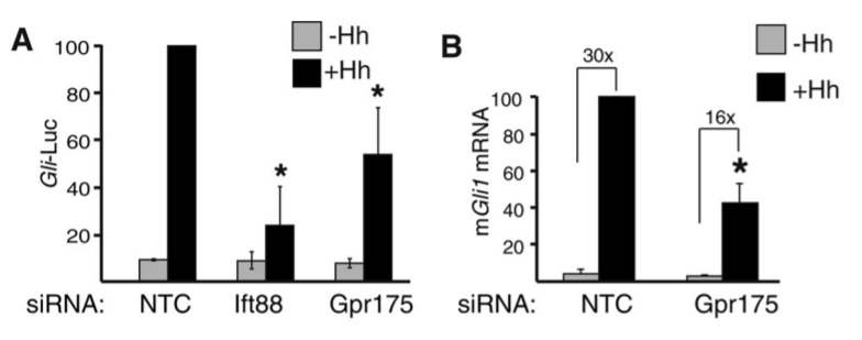 PKA intervient aussi dans la conversion de GliA en GliR. Lors de la fixation de Shh, le récepteur à 7 domaines transmembranaires GPR175 (aussi nommé TPRA1) est transloqué dans le cil et active la protéine Gα-i ce qui diminue la quantité d’AMPcyclique (AMPc) et réduit l’activité de PKA (Singh et al., 2015).