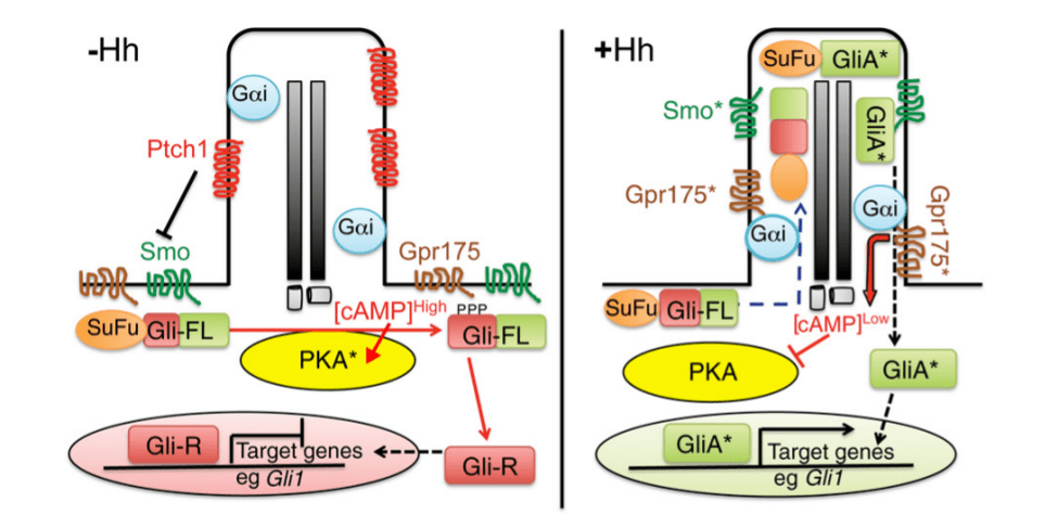 A droite : En présence de Hh, Ptch1 est retiré du cil, permettant à Smo d’entrer dans le cil et d’être activé. Cela conduit à l’accumulation de Gpr175 dans les cils, où il interagit avec Gα-i ce qui inhibe la production locale d’AMPc, empêchant l’activité de la PKA et le clivage Gli3. Le complexe SuFuGli-FL s’accumule à la pointe du cil primaire se dissocie et Gli-FL activé (GliA*) sort du cil et pénètre dans le noyau ce qui active la transcription des gènes cibles de Hh tels que Gli1. Source : https://www.jbc.org/article/S0021-9258(20)39576-4/fulltext