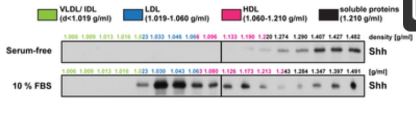 Étude par centrifugation en gradient de densité puis analyse des fractions en western-blot de Shh humain sécrété par des cellules HeLa en l’absence ou en présence de sérum bovin fœtal (FBS). Les cellules HeLa transfectées avec un vecteur d’expression de Shh ont été cultivées dans un milieu sans sérum ou en présence de 10 % de FBS, et des volumes égaux de surnageants ont été analysés. Les couleurs indiquent les fractions correspondant aux lipoprotéines bovines de très basse, basse et haute densité (VLDL, LDL et HDL). En présence de sérum, Shh s’associe majoritairement avec les LDL. Source : https://journals.plos.org/plosbiology/article?id=10.1371/journal.pbio.1001505