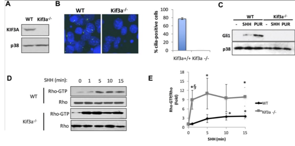 On travaille avec des fibroblastes embryonnaires de souris (MEF) sauvages (WT) ou délétés pour Kif3a qui code une protéine nécessaire au développement du cil primaire (Kif3a-/-). (A) Western blot de l’expression endogène de KIF3A dans des lysats cellulaires des différentes cellules. p38 a été utilisé comme témoin de charge. (B) Coloration des cils primaires par immunofluorescence avec un anticorps reconnaissant l’α-tubuline acétylée (vert) dans les cellules. Les noyaux ont été contre-colorés avec du DAPI. Le graphique à barres montre le % moyen ± SEM de cellules ciliées dans les deux génotypes. (C) Induction de GLI1 dans les MEF WT et Kif3a-/- après 24h de privation de sérum suivie d’une incubation de 48h en présence de véhicule (-), de 2,5 µg/ml SHH, ou 5 µM purmorphamine (PUR), un activateur de la voie Shh. (D,E) Etude par western-blot et quantification de Rho activé (lié au GTP) sur la quantité de Rho total dans les MEF avec les différents génotypes avec des durées différentes de stimulation avec SHH. Les rapports ont été exprimés relativement à t = 0. Source : https://journals.plos.org/plosone/article?id=10.1371/journal.pone.0203170