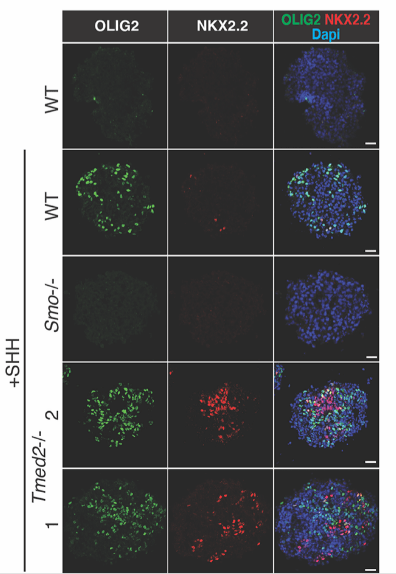 De son côté, la protéine TMED2 retient SMO dans le reticulum endoplasmique et dans l’appareil de Golgi diminuant ainsi la présence de SMO à la membrane plasmique. La voie de signalisation SHH est ainsi moins activée dans les cellules-cibles (Di Minin et al., 2022).
