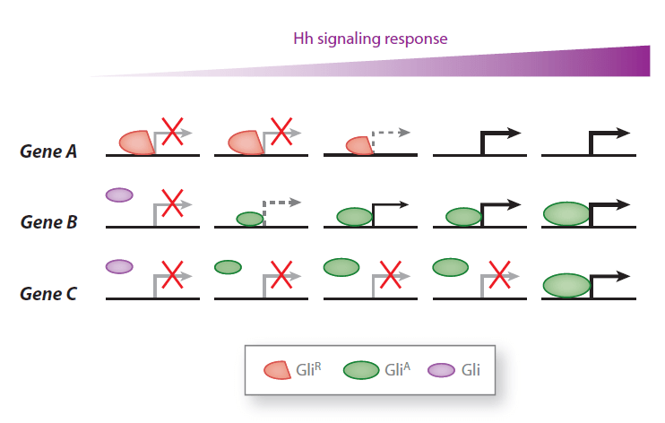 Une fois que Patched est inactivé par Hedgehog, Smoothened rentre dans le cil et il inactive la PKA et SuFu qui faisait se transformer les facteurs de transcription Gli en leur forme répressive (GliR, clivés et réduits à leur partie C-terminale). Les Gli prennent donc une forme activatrice de la transcription quand la voie Hedgehog est activée. Ce sont des facteurs de transcription dont le domaine de fixation à l’ADN est à doigts de zinc. En présence de Hedgehog, Gli2 et Gli3 ne sont plus clivés et possèdent une partie N-terminale qui les rend activateur de la transcription (GliA). Gli1 est toujours activateur de la transcription mais il est très peu exprimé en absence de Hedgehog. Il est l’une des premières cibles de l’activation de la voie Hedgehog et de Gli2 et de Gli3 et sa présence renforce l’activation des gènes cibles.