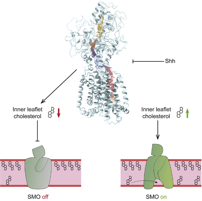 La voie Hedgehog (HH) est une voie de signalisation conservée au cours de l’évolution et elle est activée via la fixation du ligand aux récepteurs Patched (PTCH), une grande protéine à 12 domaines transmembranaires. En absence de SHH, PTCH inhibe la protéine à 7 domaines transmembranaires Smoothened (SMO) en l’envoyant à la dégradation (Taipale et al., 2002). Un autre mécanisme complémentaire implique l’élimination par PTCH du cholestérol du feuillet interne de la membrane plasmique, cholestérol dont a besoin SMO pour être actif (Kinnebrew et al. 2021). La liaison de SHH au récepteur PTCH libère cette inhibition en bloquant le conduit hydrophobe dont se sert PTCH pour faire sortir le cholestérol du feuillet interne de la membrane plasmique (Zhang et al., 2018), le rendant disponible pour SMO, mais aussi en provoquant l’endocytose de PTCH grâce à l’action des E3 ubiquitine ligase Smurf1/2 (Yue et al., 2014).