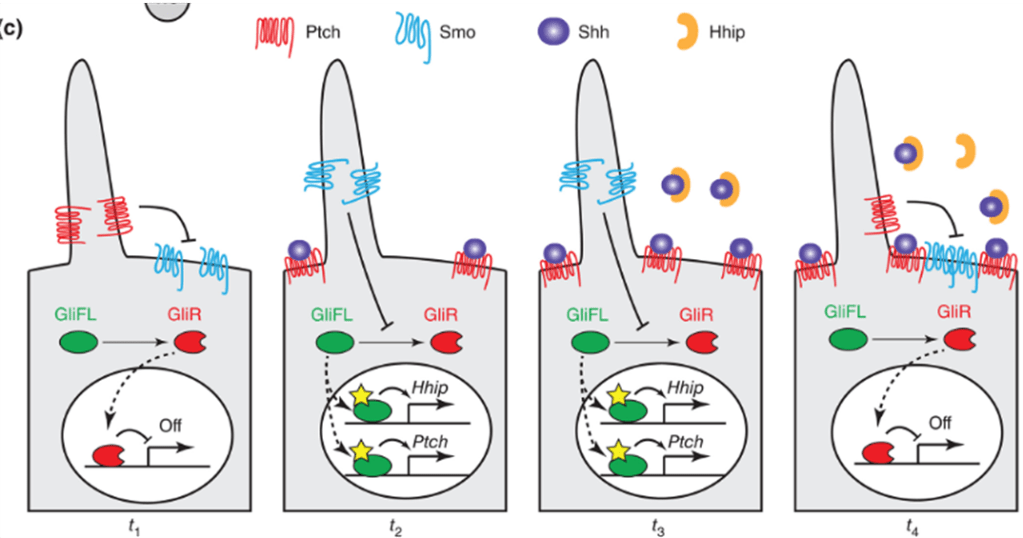 Par ailleurs, l’activation de la voie Shh peut elle-même activer sa propre inhibition par l’activation de l’expression de Patched1 qui est une cible habituelle des Gli activateurs et par l’activation de l’expression de Hhip qui piège Shh avant qu’il ne puisse agir sur son récepteur. Il s’agit d’une boucle de rétroaction négative.