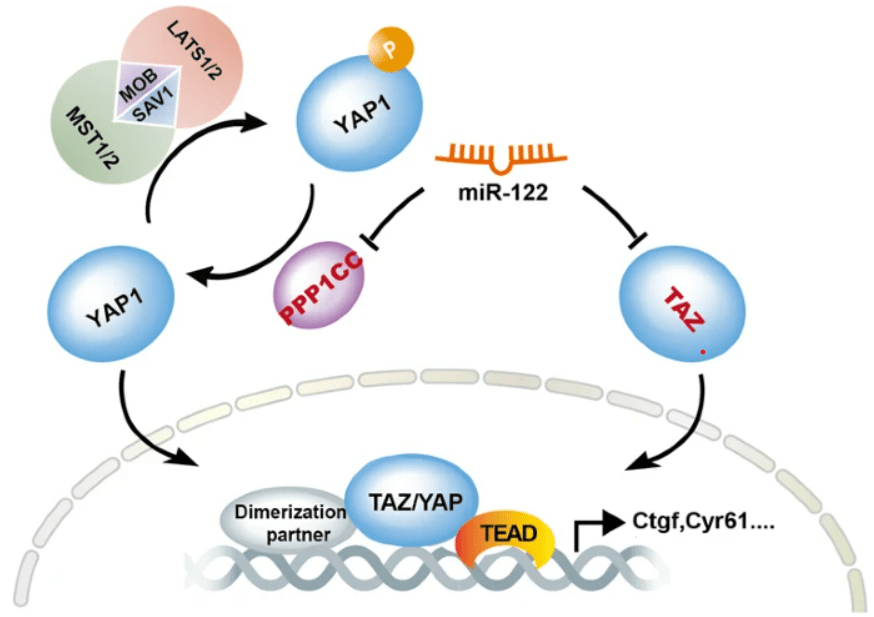 Une inhibition de YAP/TAZ aboutit donc à la fin de la prolifération et permet la différenciation. Cela a été bien démontré au cours du développement des hépatocytes où un miARN, miR-122, inhibe la traduction de deux composants de la voie : TAZ et la phosphatase PPP1CC (qui déphosphoryle YAP1 et lui permet d’échapper à la dégradation). miR-122 s’oppose ainsi à YAP/TAZ qui sont nécessaires pour la prolifération des précurseurs des hépatocytes (Zhang et al., 2021).