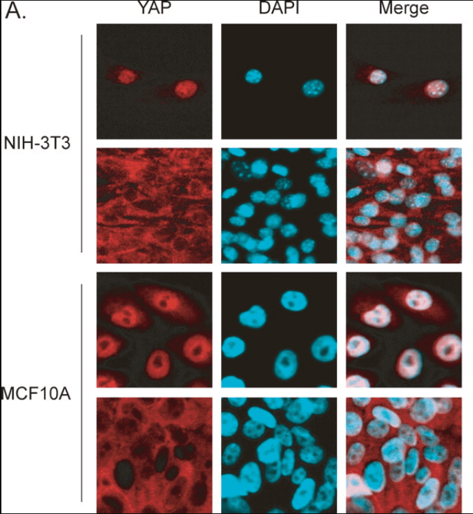 de petites zones adhésives favorisant une petite taille de cellule, sur une matrice extracellulaire molle ou sur des micropiliers pliables), YAP et TAZ sont inactivés et se relocalisent dans le cytoplasme.