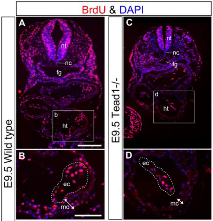 YAP est donc actif dans le noyau en phase proliférative des cellules. Au cours du développement embryonnaire, YAP et également TAZ sont des régulateurs de la prolifération cellulaire et de la croissance tissulaire (Camargo et al., 2007 ; Lei et al., 2008 ; Ota et Sasaki, 2008). YAP/TAZ déclenchent la prolifération des progéniteurs mésenchymateux gastro-intestinaux (Cotton et al., 2017) et des cellules de la crête neurale crânienne (Wang et al., 2016). YAP à lui seul contrôle également la prolifération des cardiomyocytes avec l’aide de TEAD (Ota et Sasaki, 2008; Heallen et al., 2011) et des cellules épithéliales pulmonaires (Lin et al., 2017).