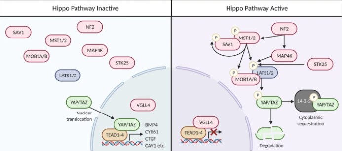 Lorsque la signalisation Hippo est activée, les composants en amont de la voie de signalisation, Mst1/2 et Sav1 sont phosphorylés, puis activent les kinases Lats1/2 qui phosphorylent YAP et TAZ (Misra et Irvine, 2018). Ces phosphorylations aboutissent à la dégradation de ces protéines. Elle est réalisée par le protéasome après ubiquitinylation par la E3-ubiquitine ligase SCFβTRCP (également connu sous le nom de BTRC) (Zhao et al., 2010). Lorsque la signalisation Hippo est désactivée, YAP et TAZ fonctionnent comme des co-activateurs transcriptionnels et forment un complexe dans le noyau avec des facteurs de transcription, notamment ceux de la famille TEAD, et activent l’expression de multiples gènes cibles (Hong et Guan , 2012, Wang et al., 2018).