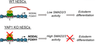 Dans des gastruloïdes en 2D générés à partir de cellules souches humaines, YAP1 est nécessaire à la mise en place de l’ectoderme. En absence de YAP, du mésoderme et de l’endoderme se forme à son détriment. YAP est nécessaire pour limiter l’activation de la voie de signalisation Nodal et ainsi permettre à de l’ectoderme d’être déterminé (Stronati et al., 2022).
