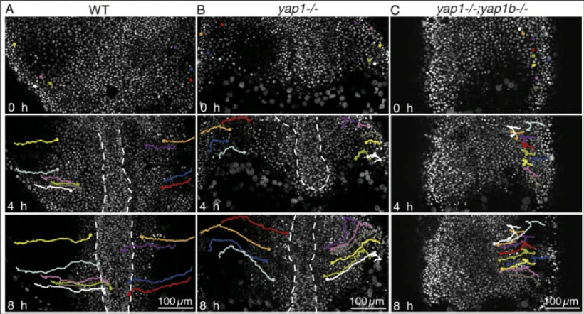 En conclusion, YAP/TAZ agissent en tant qu’intégrateurs principaux de stimuli chimiques et mécaniques dans différents contextes biologiques. Ils sont donc impliqués dans de nombreux processus migratoires qui doivent intégrer les signaux biochimiques et biomécaniques. Par exemple, YAP est nécessaire aux mouvements de convergence extension chez le poisson-zèbre, nécessaire à l’allongement de l’embryon selon l’axe antéro-postérieur (Sousa-Ortega et al., 2023).